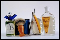 Software Geo F. Trumper Sandalwood Skin Food (som Pre Shave). Mitchell's Wool Fat Barbersæbe. Truefitt and Hill Ultimate Comfort aftershave balm.