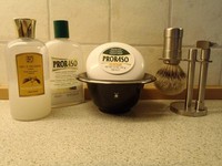 Software Geo F. Trumper Sandalwood Skin Food (som Pre Shave). Mitchell's Wool Fat Barbersæbe. Proraso Aftershave - Liquid cream.