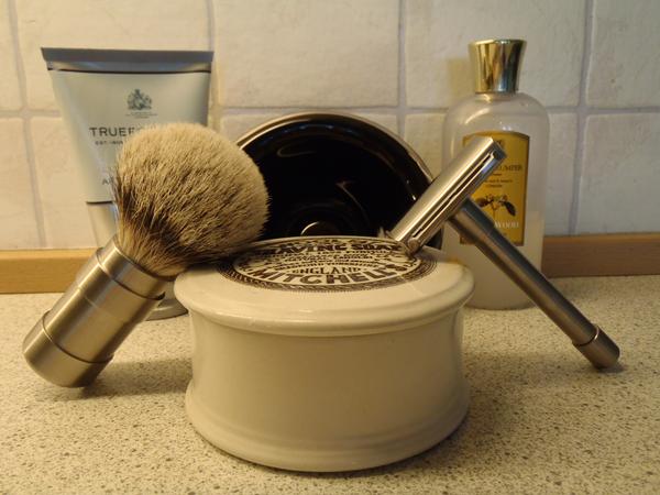 Software Geo F. Trumper Sandalwood Skin Food (som Pre Shave). Mitchell's Wool Fat Barbersæbe. Truefitt and Hill Ultimate Comfort aftershave balm.