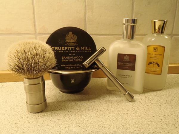 Software Geo F. Trumper Sandalwood Skin Food (som Pre Shave). Mitchell's Wool Fat Barbersæbe. Truefitt and Hill Ultimate Comfort aftershave balm.