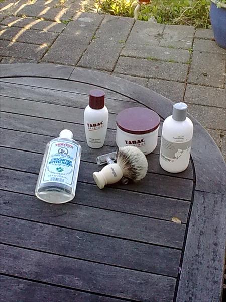 Merkur 34C m/Feather blad (favorit bladet i øjeblikket) Shavemac silvertip kost Anthony's facewash Tabac sæbe Tabac aftershave Thayer's with hazel