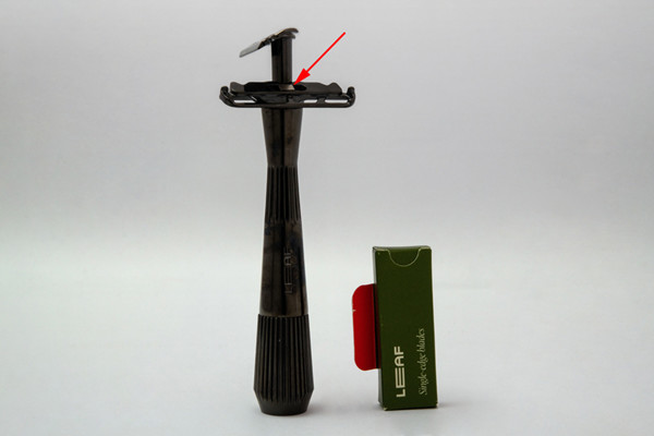 Der er en rigtig smart detalje; der sidder en lille magnet i base-pladen som ”griber” bladet, og har man ikke ramt helt rigtig, kan man lirke det på plads derefter. Magneten er stærk nok til at skraberen kan vendes på hovedet uden det falder af, hvilket jeg synes er en god feature både når bladet sættes, og når det fjernes igen (magneten er vist ved den røde pil på fotoet nedenfor)